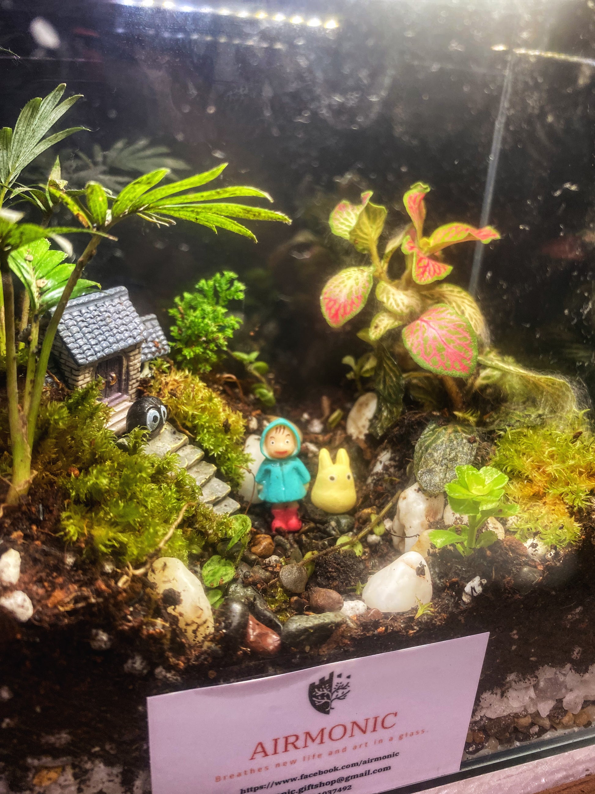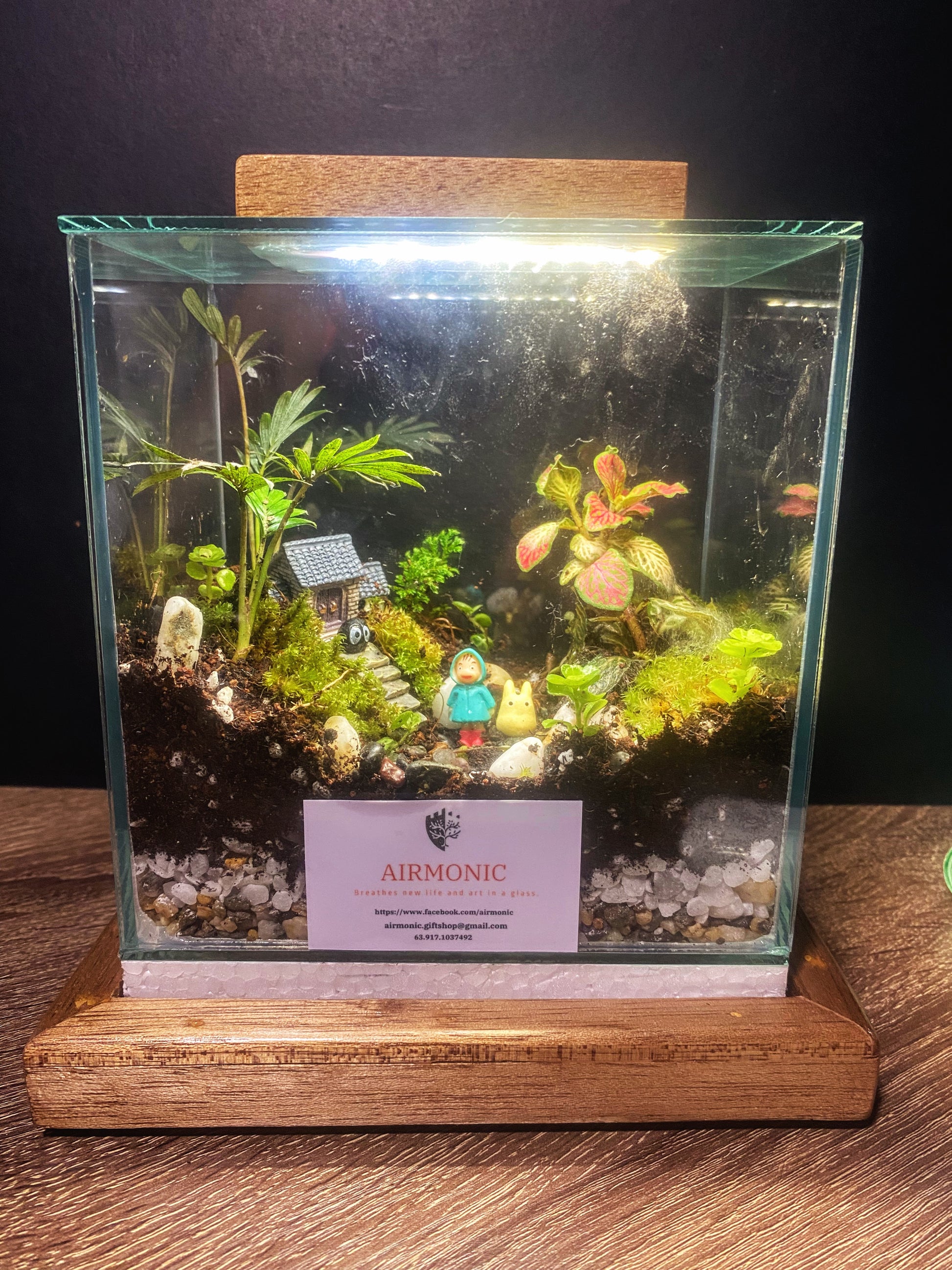 Bahay Kubo Totoro Terrarium with Soot Sprites with Lamp and Wooden Base