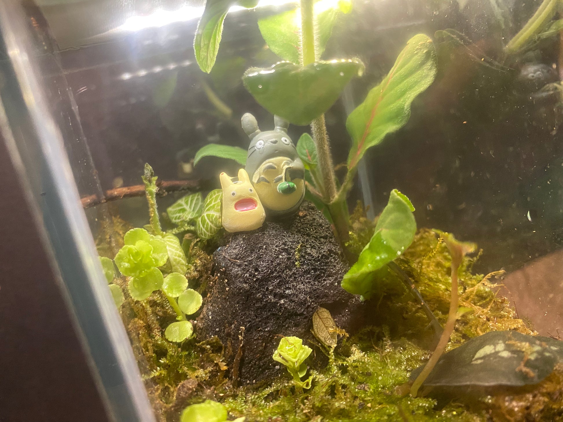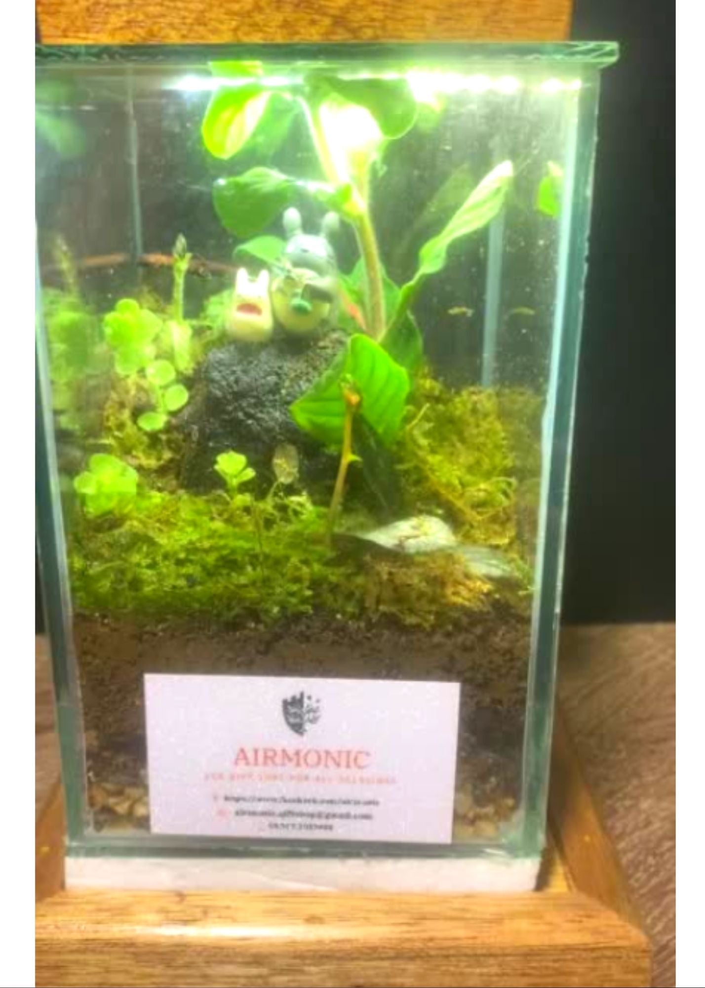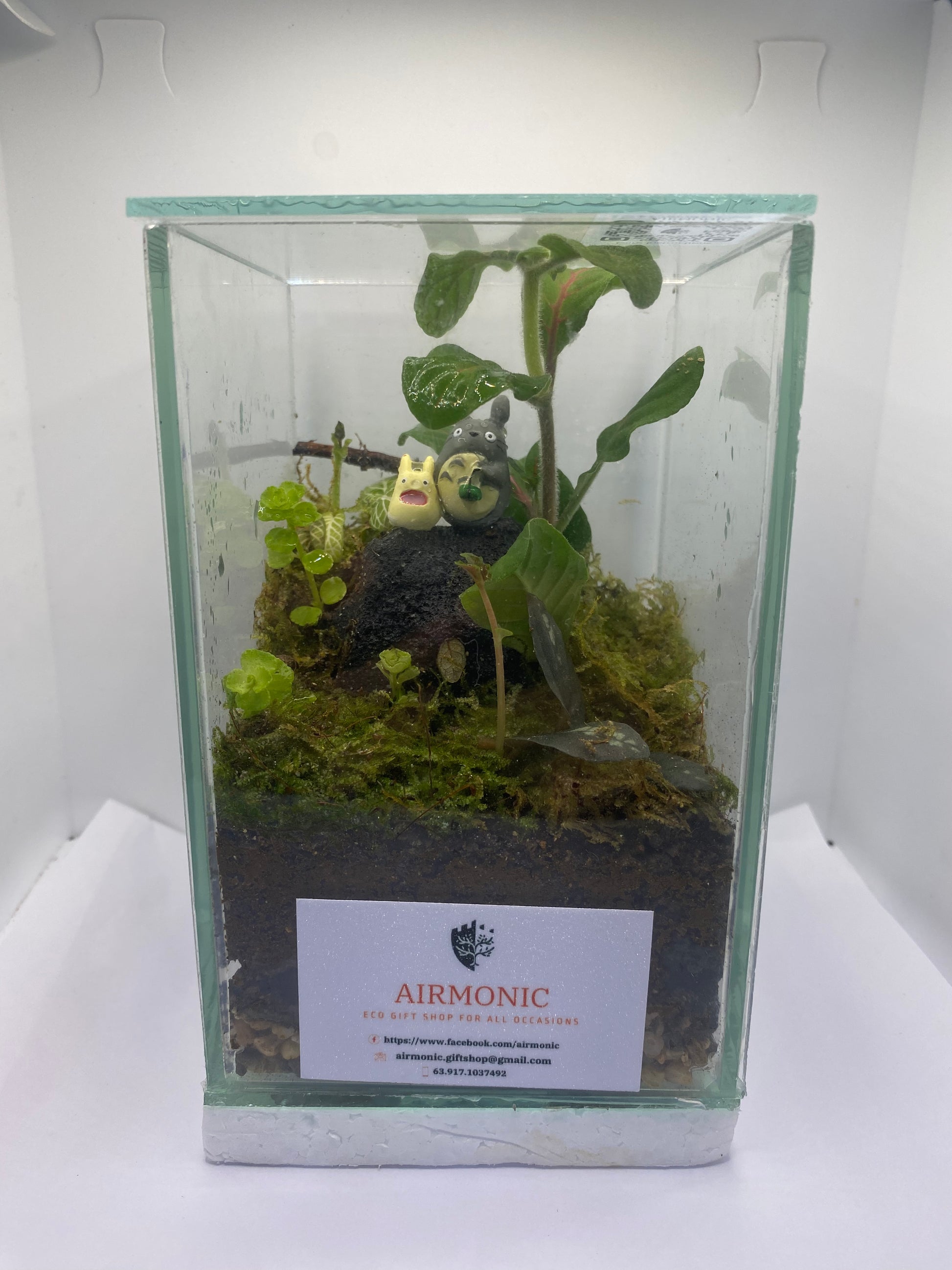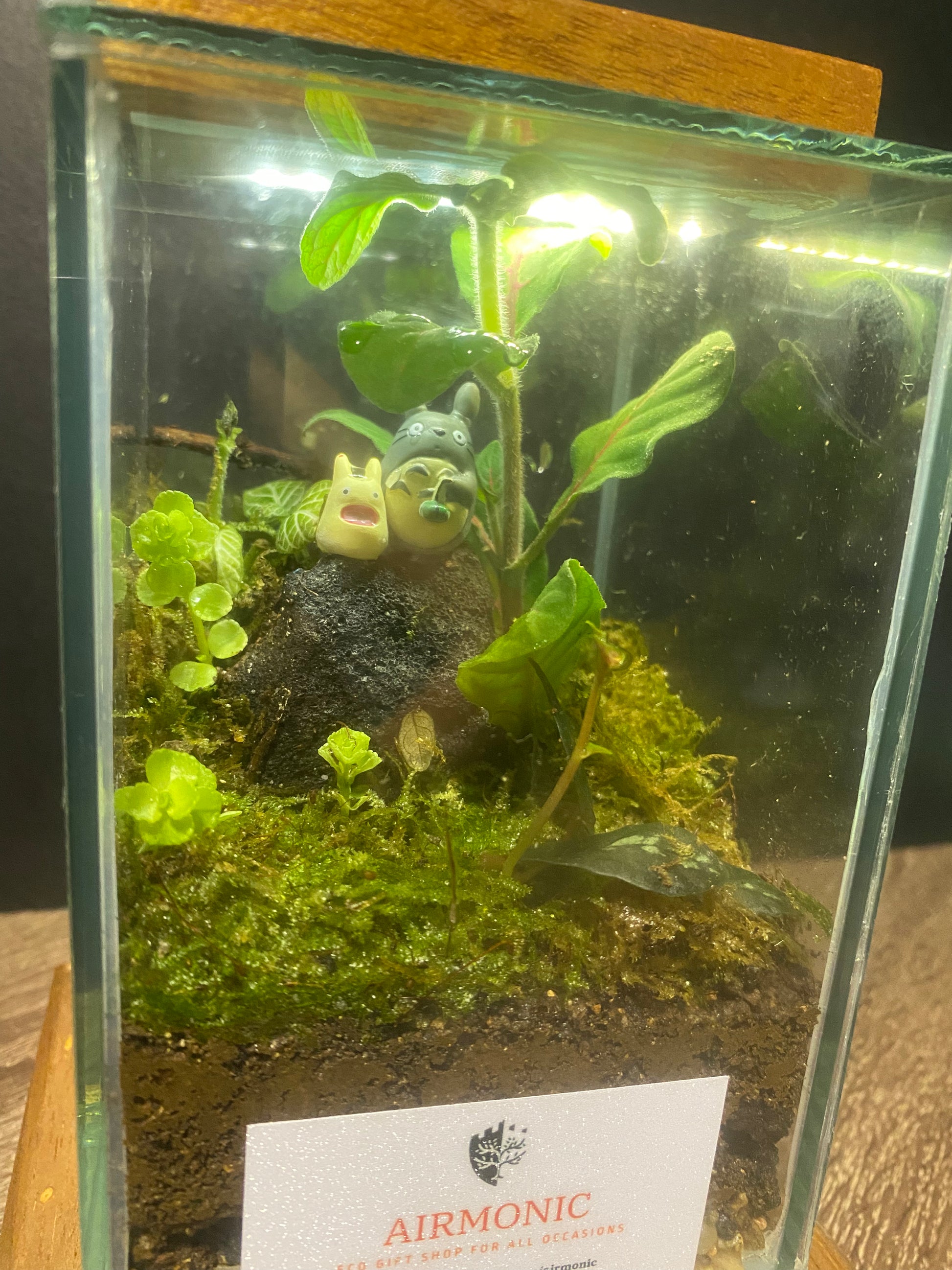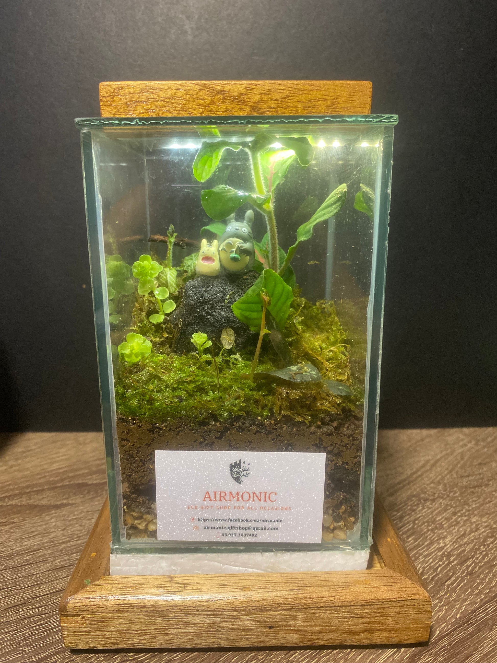 Part of our Totoro Collection, this adorable 4x4x6 inch miniature terrarium features the Big and Chibi Totoro characters in a rustic wooden base. The multifunctional cover with a wooden handle on top doubles as a LED light source, with three brightness modes controlled by a touch switch. The rechargeable battery lasts up to 4-10 hours. Perfect for anyone who loves Totoro or miniature gardens, this terrarium makes an excellent gift or addition to your collection. Add some magic to your space with this delightful display pieceChibi and Large Totoro's Miniature World