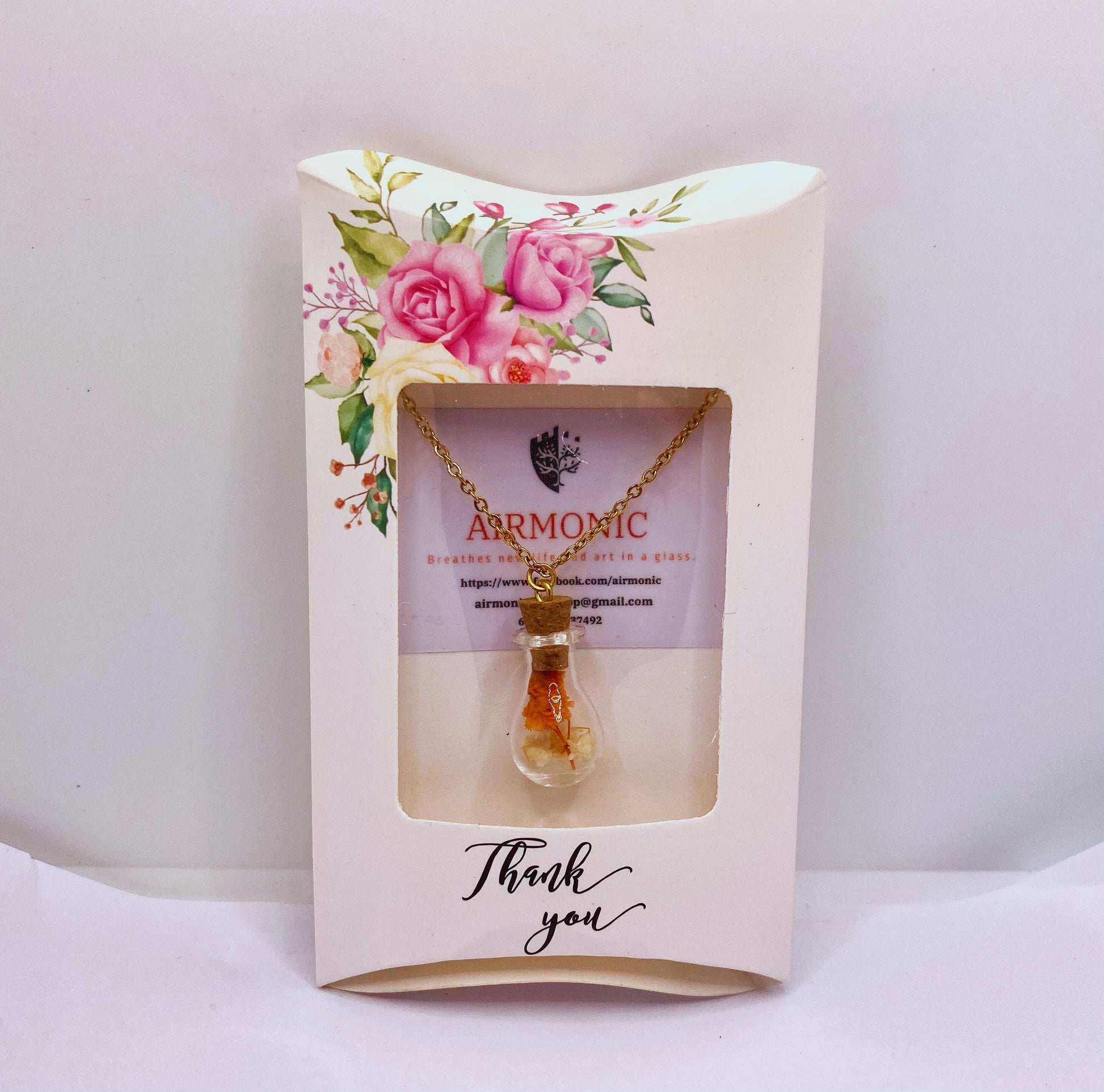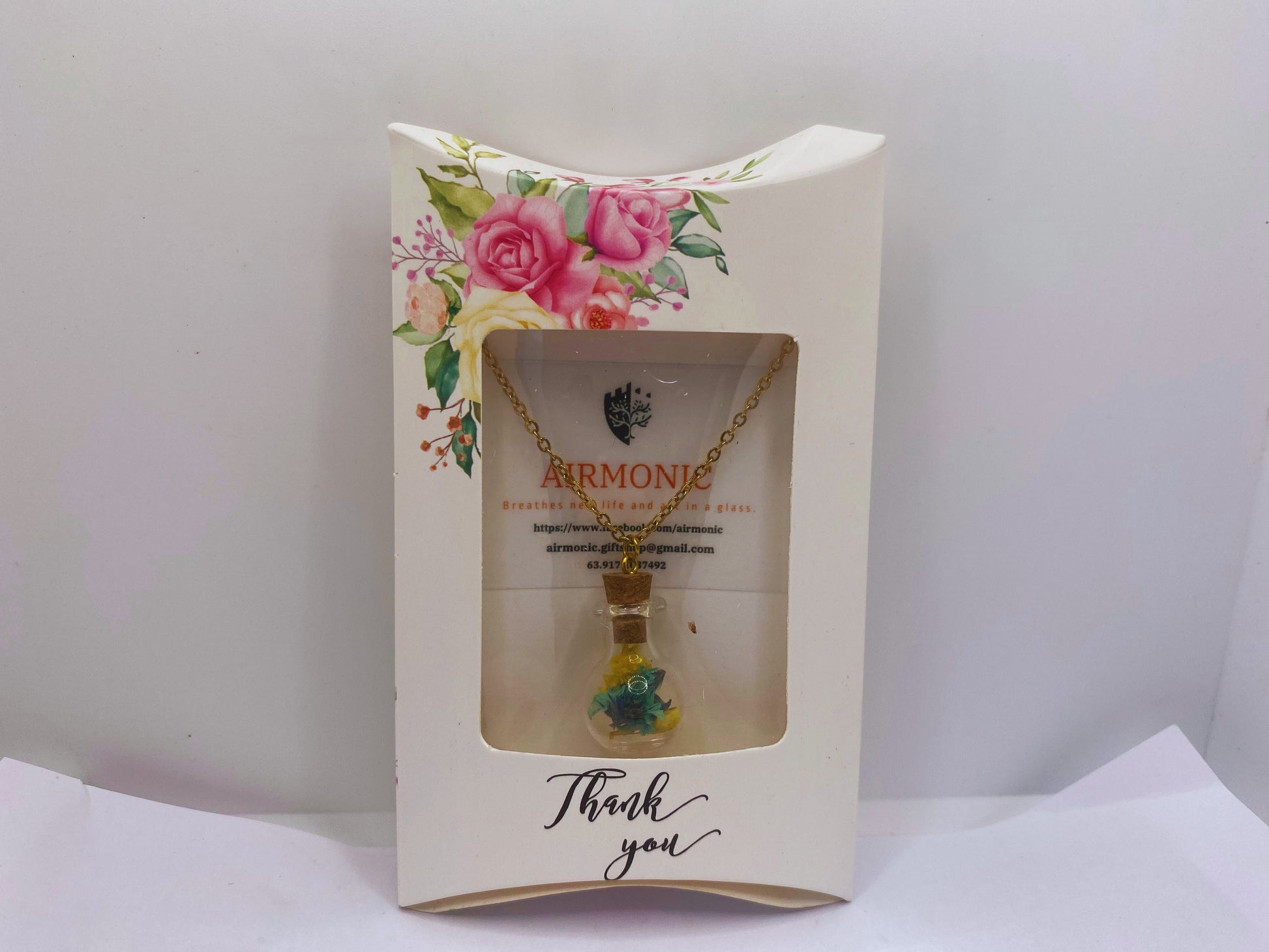 This necklace features a Bulb-shaped glass pendant filled with carefully selected dried flowers. It measures approximately 1 inch in diameter. A thoughtful gift for someone special or as giveaway for special occasions it symbolizes preservation and everlasting love. It